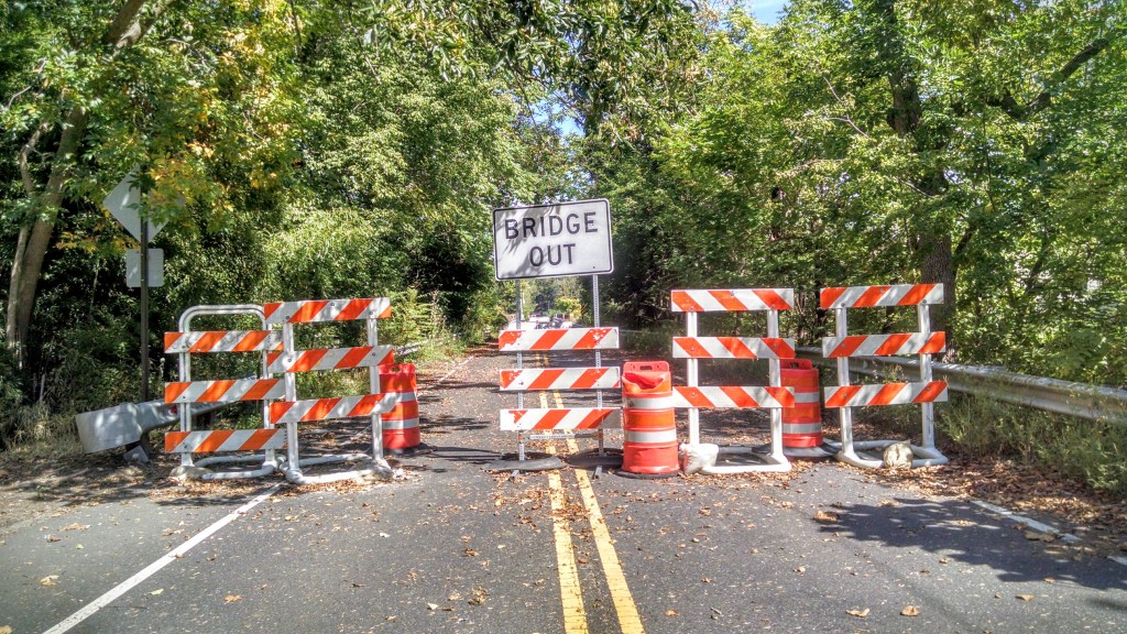 By December 1, 2018 at 3:38:45 AM I had ridden for three years, two months, 14 days and 16 hours. It was time to say goodbye to my blog and my Therapy Bridge. As news of the ultimate destruction of the bridge made the news in 2019, graffiti artists (I’m a serious fan of graffiti, by the way) rushed to make their marks on the Centerton Bridge’s remains. The township had made their final decision: the bridge would be torn down completely and nothing would be done to replace it. When COVID 19 shut down the planet in 2020, Ole Bessie and I watched in dismay as construction crews dismantled the bridge, piece by piece. By 2021, I sadly pondered if I would make it to the bridge or if I even had the wherewithal to bother. September 16th was on Yom Kippur, one of the holiest days of the Jewish year, which meant I would need to go the day before or the day after. Going into a 25-hour fast and ending the day before Shabbat, I decided September 14th was it or nothing. Mulling it over the week before, the hubby suggested, “Maybe you’re finished.” I secretly wanted it to be true. I was exhausted and dismayed by death, but it didn’t matter. I wasn’t capable of stopping, so I decided to check it out one more time, needing to know whether or not I was indeed “finished.” That ride was more difficult than I remembered in previous years (welcome to middle age) and certainly hadn’t resulted in anything unexpected, except for the multitude of newer deposited triple panel and barrel barricades with new pylons and signs warning that the “BRIDGE IS OUT,” “DO NOT ENTER,” “ROAD CLOSED” and “COUNTY PROPERTY NO TRESPASSING VIOLATORS PROSECUTED” greeting me before the eight-foot high chain-link fence encasing the Jersey barrier and restricting any entrance whatsoever. What else would I do after seven years of visiting my Therapy Bridge? I entered and violated with a vengeance, of course, joyfully challenging anyone who would forbid my opportunity to bid a final farewell. Resting poor Ole Bessie against the fence and clutching its diamonds, I watched as the tail end of Centerton Bridge on the other side was being demolished. The hubby was right – I was indeed finished…or so I thought.